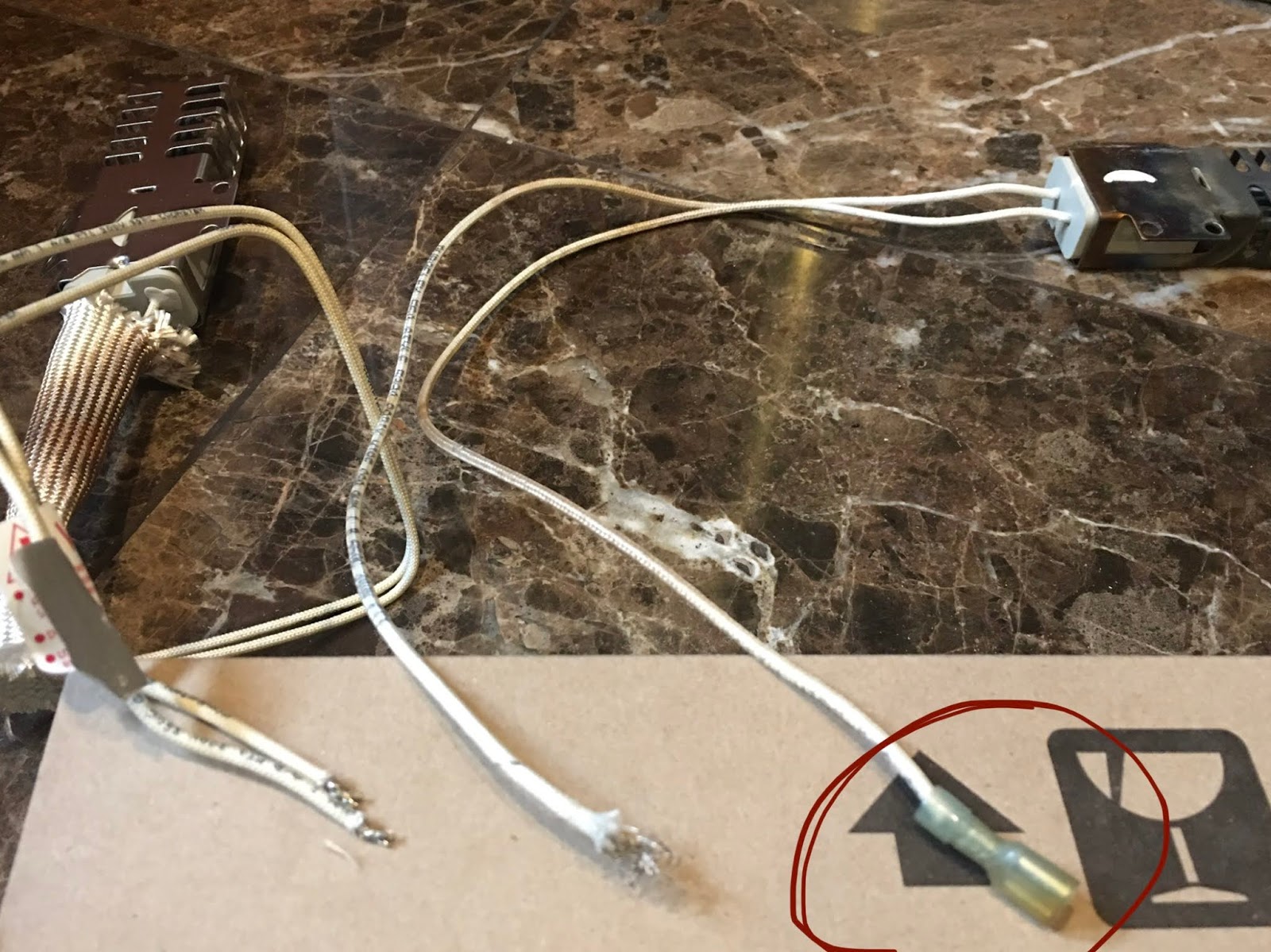 Then I tried to unplug the igniter to test the continuity but it's really hard to reach the socket. After struggled quite a while, I managed to remove the black wire on the upper part of the socket but just couldn't get another one out. I even broke the plastic cover of the wire by pulling and squeezing too hard.